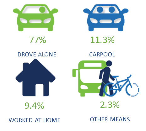 The majority of Boone County’s workers (77%) drove to work alone, which is a slightly higher rate than both the state of Illinois (73.4%) and the United States (76.4%).